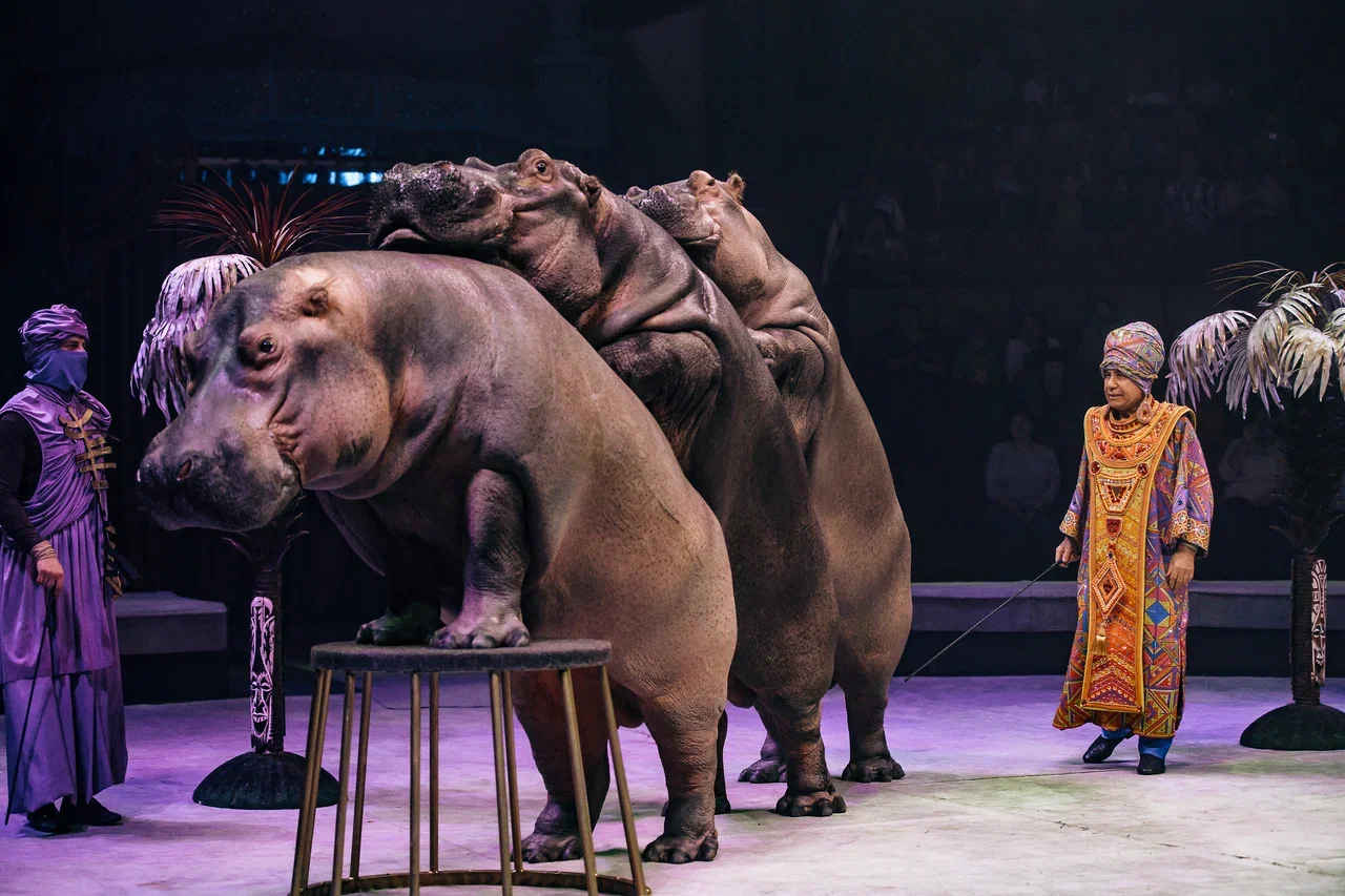 Как и во всех проектах Заслуженного артиста РФ Гии Эрадзе, в шоу «Песчаная сказка» отдельное внимание уделяется номерам с животными. Изюминка этого шоу – аттракцион с обезьянами и тремя бегемотами под руководством Народного артиста РФ Тофика Ахундова. Только представьте, эти полуторатонные тяжеловесы исполняют невероятные трюки, достойные книги рекордов Гиннесса, на расстоянии вытянутой руки от зрителей, и восхитят даже самую искушенную публику!